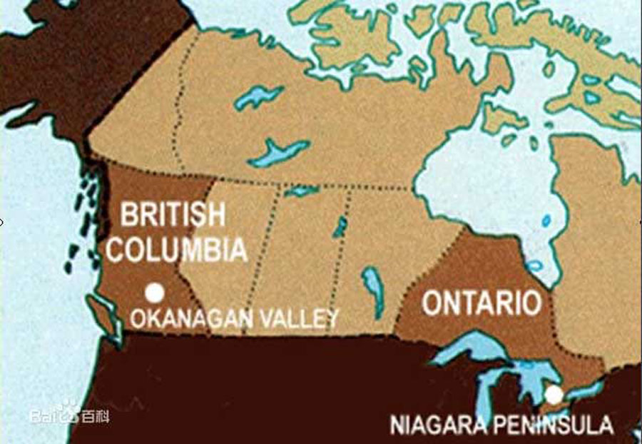 安大略省,尼亚加拉湖边小镇的葡萄酿造的冰酒更加甜美香醇。尼亚加拉瀑布所在尼亚加拉断崖横贯半岛的南边,自安大略湖往南吹来的温得湖风遇到三百公尺高的断崖之后往北吹回湖边,一来一回,在半岛的北边形成一个气流圈,将严寒的北风挡在外面。由于地理环境和气候独特,非常适合冰酒酿造,是最佳酿造冰酒的产地之一。安大略省冰酒总产量占全加拿大的70%。